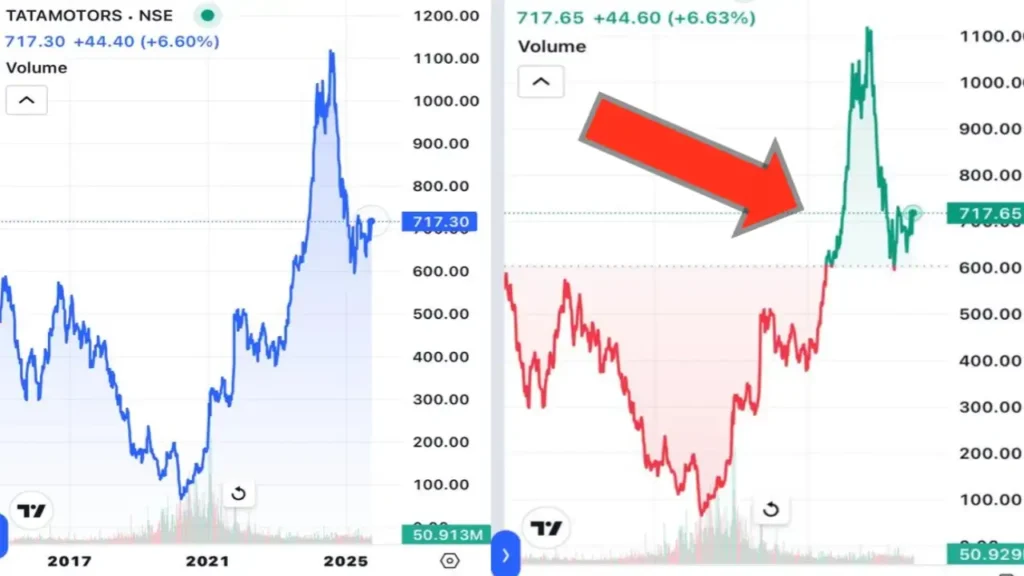 टाटा मोटर्स के शेयर ने हाल के समय में निवेशकों को खासा खुश किया है। पहले जहाँ जनवरी 2023 में इसके शेयर की कीमत करीब ₹23 थी, वहीं अब यह बढ़कर लगभग ₹718 तक पहुँच गई है। इस तेजी के पीछे कंपनी की मजबूत बिक्री, नए प्रोडक्ट लॉन्च और इलेक्ट्रिक वाहनों (EV) में तेजी से बढ़ता फोकस मुख्य वजह है। टाटा मोटर्स ने अपने वाणिज्यिक और यात्री वाहनों के बिज़नेस में नए बदलाव किए हैं, जिससे कंपनी का भविष्य और मजबूत नजर आता है।